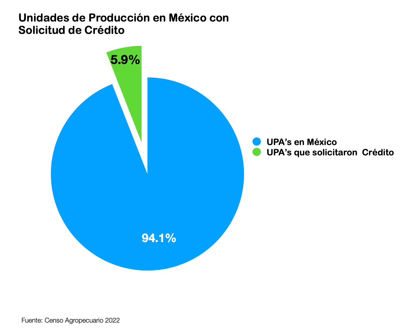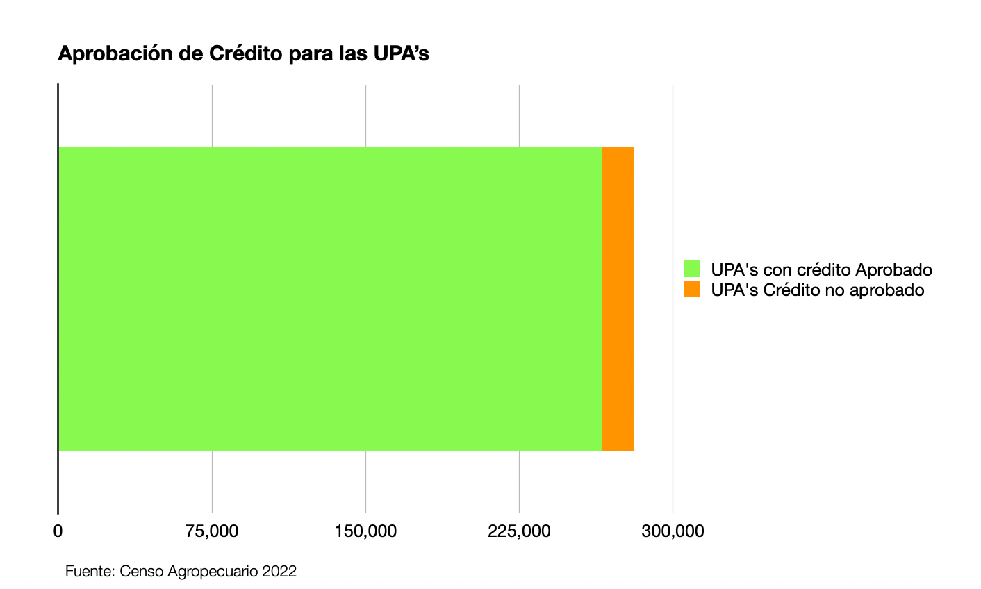LA cantidad de Unidades de Producción Agropecuaria (UPA’s) según el Censo Agropecuario 2022 son 4,444,065 , y 281,042 UPA’s que solicitaron un crédito, con lo que lo obtuvieron con crédito un 265,508, esto es, un 94.45% logró tener acceso al recurso.